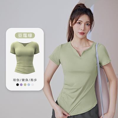 おしゃれヨガウェア お家ヨガウェア Vネック ストレッチ 無地 着痩せ シャーリング ヨガウェア