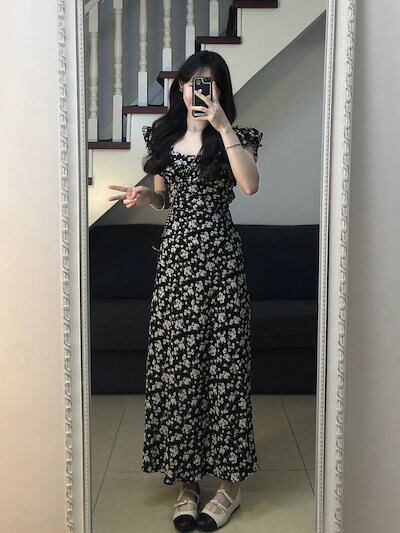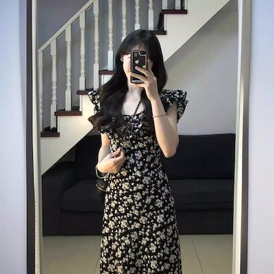 2024夏新品!!!夏 人気 韓国ファッション 花柄 ウエスト引き締め ロングワンピース ドレス フレンチ ブラック 通勤 通学
