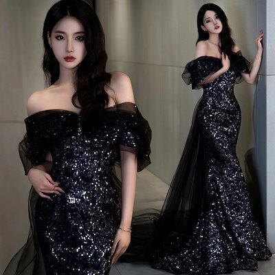 2024新品追加パーティドレス フレンチ ブラック ワンピース 韓国ファッション フィッシュテールスカート 卒業式 結婚式 誕生日 演奏会 花嫁 司会