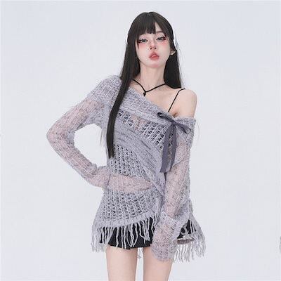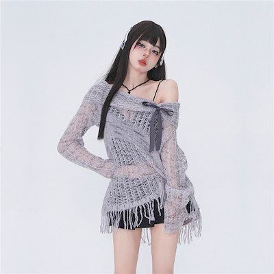 2024新入荷 スーツ集合 韓国ファッション 春夏 グレーのリボンセーター 長袖 ゆったり Tシャツファッションクール ニット フリンジトップスブラウス