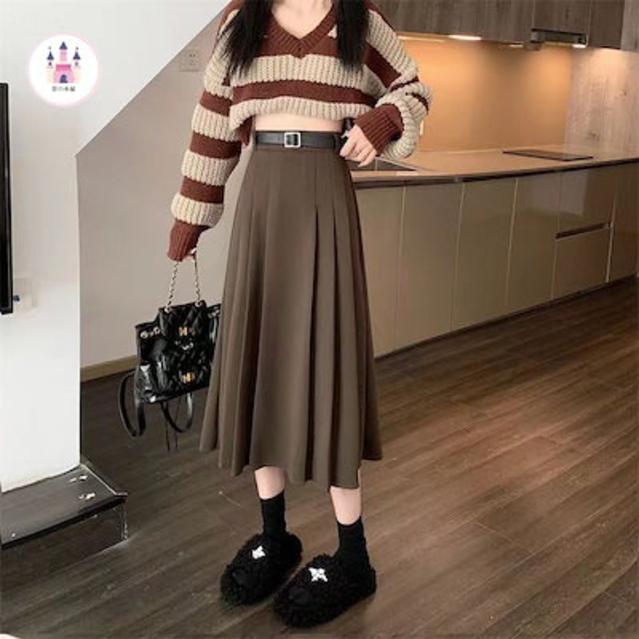 ツイードプリーツ秋冬2024年新作韓国版ミディアム丈スカート婦人服ハイウエストスリムa字スカート