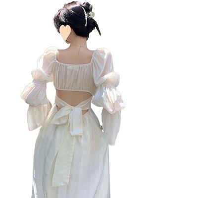 ワンピース バブルスリーブ ドレス レディース 秋の新作 フレンチスタイル スクエアネック デザイン ストラップ ロングスカート 韓国
