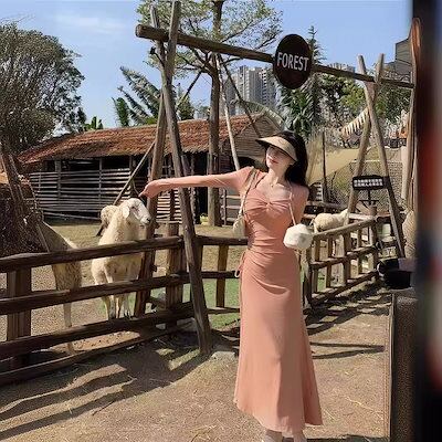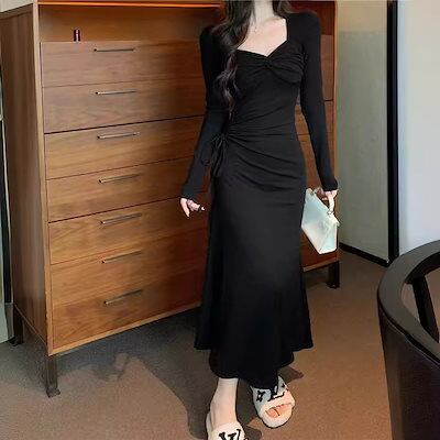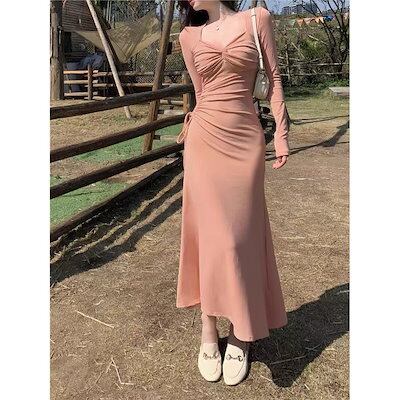 ワンピース 長袖 スクエアネック ドレス レディース 春と秋 プリーツ ウエスト ミドル丈ワンピース 韓国