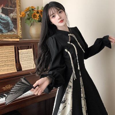 ワンピース ヴィンテージ ニューチャイニーズ 改良型 チョンサム 大きな裾 ロングスカート レディース 秋 プリント パッチワーク 長袖 ドレス 韓国