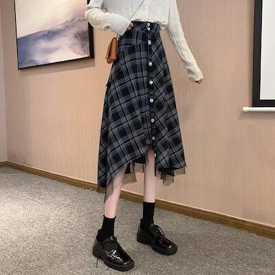 マキシスカート 2024年夏秋新 イレギュラー 格子柄 ハーフスカート レディス ハイウエスト ミドル丈スカート デザイン ブラック 韓国
