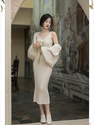 韓国ファッション 春秋 ニット ジェントルスタイル 長袖 セット おしゃれ 気質 着痩せ ワンピース ジャケット 二点セット