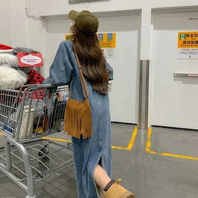 レトロ ブルー デニム ワンピース 春秋 2024 新作 カジュアル 韓国 着痩せ セミロング シアーシャツ ワンピース ヘビロテ!キャミワンピース
