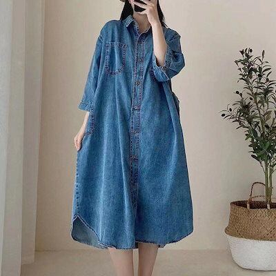 大きいサイズ デニムロングワンピース デニムワンピース 七分袖 きれいめ レディース 春 夏 秋 ロング デニムワンピ サロペット マキシ丈 Aライン ポケッ