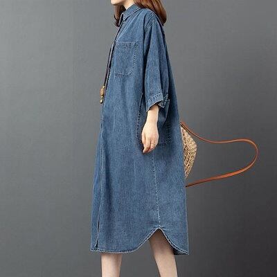 大きいサイズ デニムロングワンピース デニム デニムワンピース 七分袖 きれいめ レディース 春 夏 秋 ロング デニムワンピ サロペット マキシ丈 Aライン ポケッ