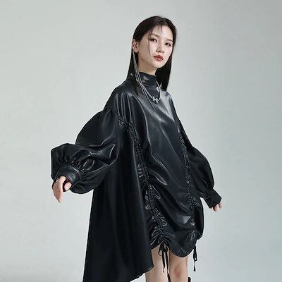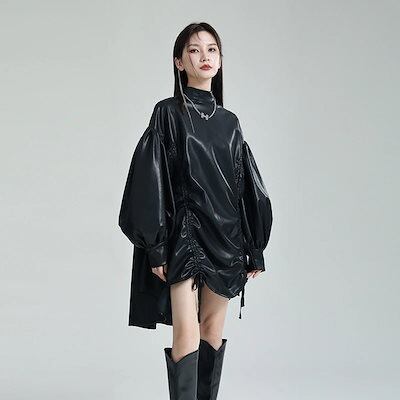 秋冬 新作 おしゃれ 気質 ワンピース 立ち襟 ランタン袖 長袖 ワンピース PU 不?? ワンピース