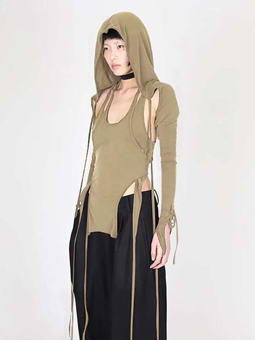 女性のゴシックフーディ,透かし彫りの包帯,原宿の美学,スリムフィット,長袖,不規則なトップ,ゴミ,Tシャツ,新しいコレクション T240926004435_01