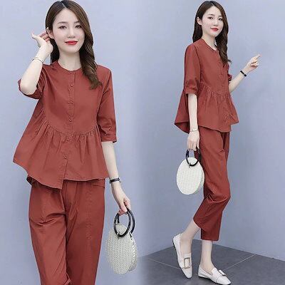 夏 涼しく楽ちんセットアップ 2024 切り替え セットアッ 上下セット 半袖ブラウス ズボン 接触冷感 2点セット