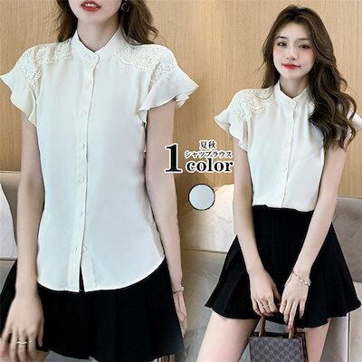 半袖ブラウス 無地 シフォンシャツ トップス フリル袖 レース 切り替え きれいめ 夏秋物 レディース 気質 着痩せ 韓国風 お出かけ デート 食事会 二次会