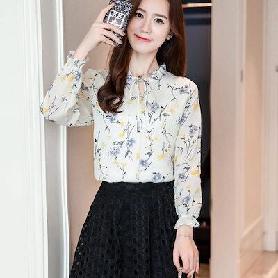 新入荷 ブラウス レディース シャツ 長袖 花柄 シフォン パフスリーブ フラワー ゆったり 着痩せ 普段着 通勤 OL 春秋 可愛い