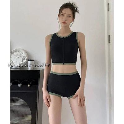 フィットネス水着 レディース セパレート 体型カバーママ水着 おしゃれ かわいい 女性用 上下セット 小胸 盛れる 黒 20代 30代 40代 ぽっちゃり 露出控えめ