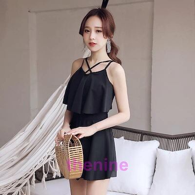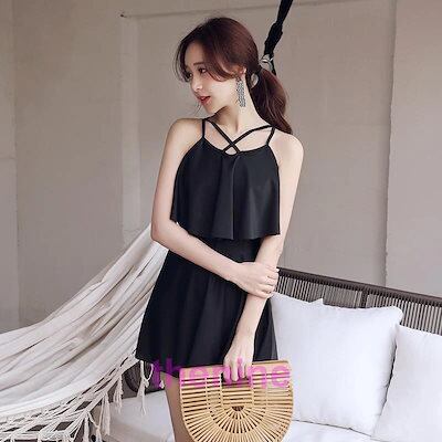 水着 ワンピースタイプ レディース 女性用 婦人用 スイムウェア 水泳用品 ミニ丈 袖なし クロスストラップ フレア 無地 単色 ブラック 黒 かわい