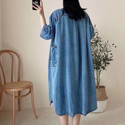 【2枚購入で 4oo円OFF! 】大きいサイズ デニムロングワンピース デニムワンピース 七分袖 きれいめ レディース 春 夏 秋 ロング デニムワンピ サロペット マキシ丈 Aライン ポケッ