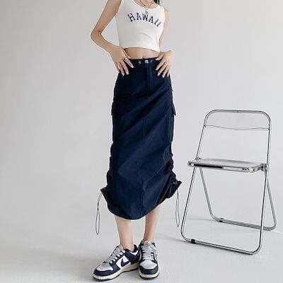 【2枚購入で 2oo円OFF! 】2024夏新作 韓国ファッション 着痩せ ハイウエスト Aライン スリット スカート スタイルアップ カジュアル セミロング カーゴパンツ ワンピース