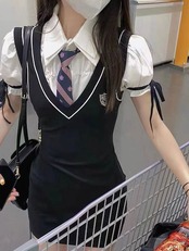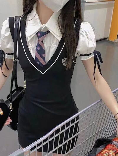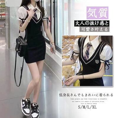 【2枚購入で 1oo円OFF! 】キャンパス風 フェイクレイヤード 小柄 可愛い 英?風 jk制服 セットアップ 二点セット夏 レディース バブル袖 日韓ファッション 夏服 韓国ファッション