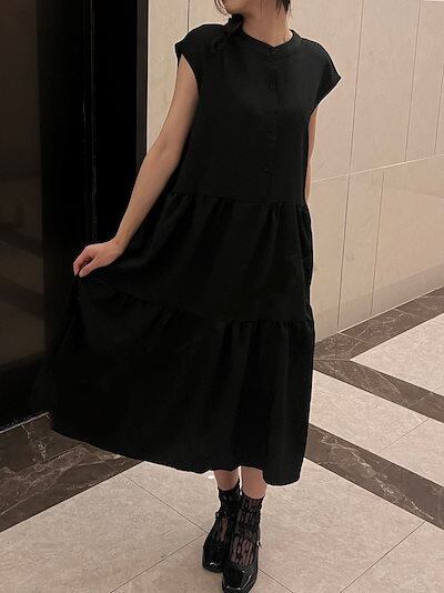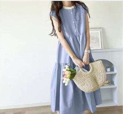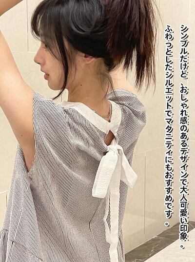 【ラッキーブレスをプレゼントに】ワンピース レディース シャツワンピース きれいめ バックリボン ティアード Aライン ストライプ 無地 フレンチスリーブ ロング マキシ 体型カバー ゆったり 袖な