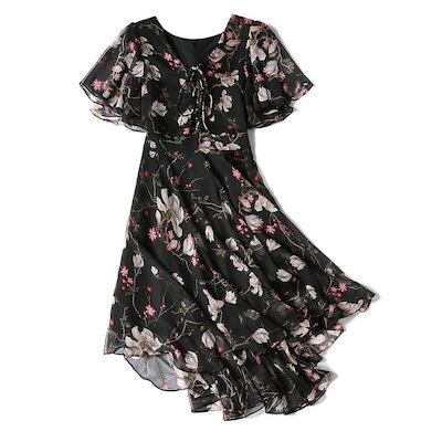 【送料無料】ワンピース シフォンワンピース 夏 レディース ロングワンピース 花柄 プリーツ リゾート ロング 膝丈 ミモレ丈 シフォン きれいめ Aライン フレア 大人 上品 半袖 大きいサイズ カ