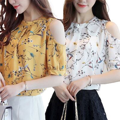 【メール便送料無料】レディース シフォン ブラウス 半袖 オフショル シャツ トップス 花柄 肩出し ホルターネック 大人 上品 きれいめ 可愛い オープンショルダー オフショルブラウス 肩開き オフ