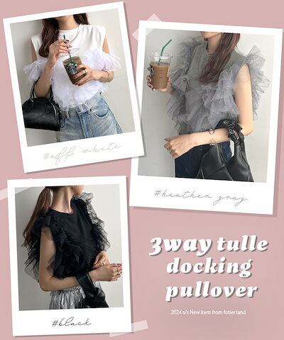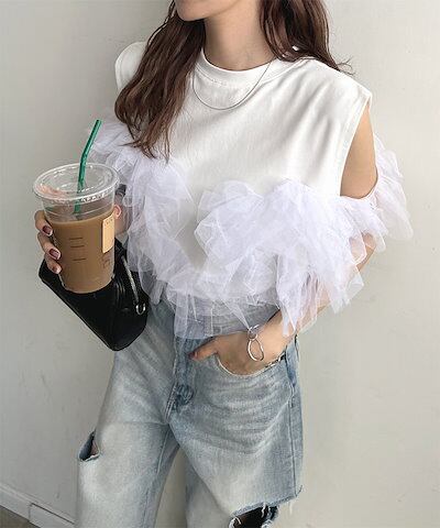 OFFクーポン利用で高評価レビュー!【予約】【動画あり】トップス カットソー ノースリーブ チュール ドッキング レディース 夏 カジュアル ゆったりサイズ ラフ シンプル 大人