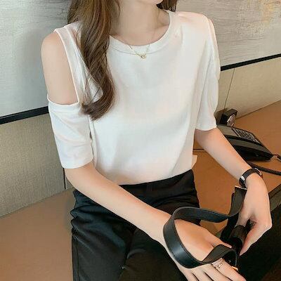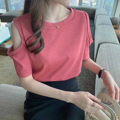 半袖 グレー カットソー Tシャツ レディース 肌見せ 半袖Tシャツ 無地 オフショル 肩出し 肩あき 送料無料 クルーネック 夏 トップス ゆったり ビッグTシャツ ブラック ホワイト オフショルダ