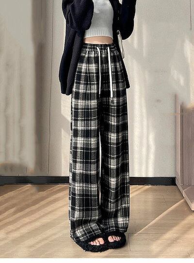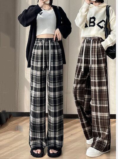 ワイドパンツ レディース タータンチェック ストレートパンツ 秋冬 ウエストゴム チェック柄 ハイウエスト ボトムス ロング パンツ イージーパンツ ゆったり 体型カバー きれいめ おしゃれ カジュア