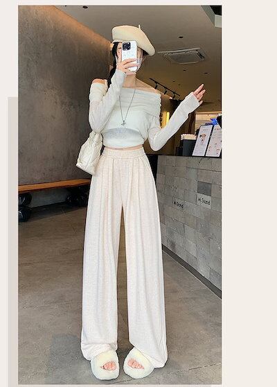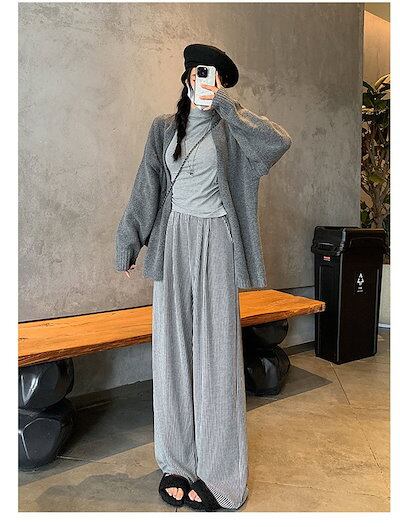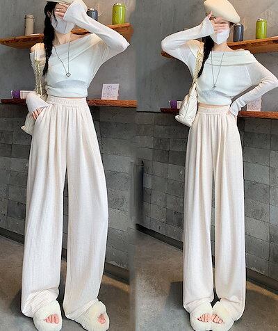 ストライプパンツ レディース 秋冬 ロングパンツ ストライプ ワイドパンツ ふわふわ ウエストゴム リラックス 防寒 暖い カジュアル ボトムス ハイウエスト フロントタック 体型カバー イージーパン