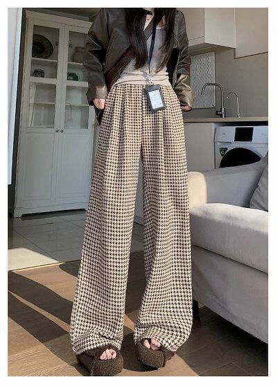 ワイドパンツ レディース ストレートパンツ 千鳥格子 ロングパンツ チェック ボトム フロントタック イージーパンツ 秋冬パンツ ワイド 脚長 美脚 ボトムス ズボン 秋 冬 ウエストゴム ベージュ