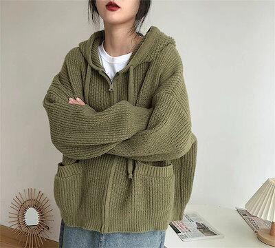 ニットパーカー レディース ジップパーカー 無地 カーディガン 長袖 ファスナー 春秋 ニットカーディガン セーター 羽織り リブ アウター フード付き トップス カジュアル シンプル 大人可愛い ゆ