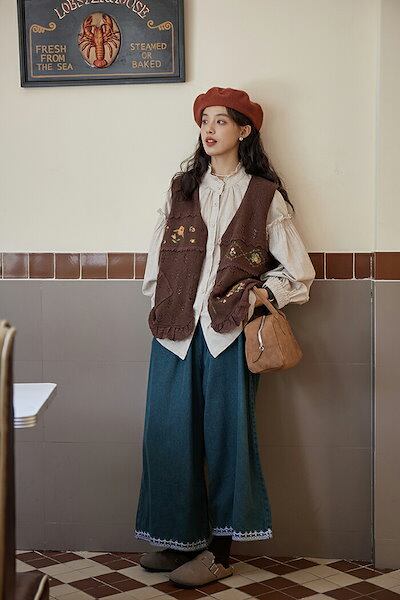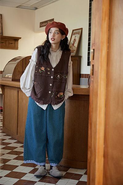 ワイトパンツ レディース キレイめ 刺繍 春秋 デニム デニムパンツ ボトムス スウェット ゆったり おしゃれ ロングパンツ カジュアル 無地 ポケット リラックス ウエストゴム 大人可愛い ダークブ