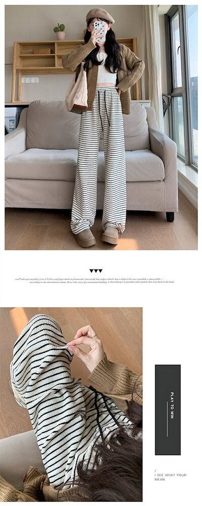 ワイドパンツ レディース きれいめ ロングパンツ ボーダー柄 ストレートパンツ 秋冬 ロング丈 ワイド パンツ ウエストゴム ストレート 柔らか ズボン 大きいサイズ 体型カバー ゆったり カジュアル