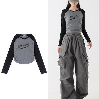 長袖ブラウス 春秋プリーツウエストショートトップス女性カラーブロックポジティブショルダースリムパターンボトム長袖Tシャツ