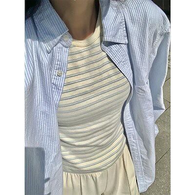 ブラウス 夏ストライプシャツ女性長袖シャツジャケットサンプロテクトップス