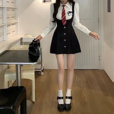 JK制服カレッジスタイルウエストスリムフェイクツーピースワンピース長袖ワンピースショートワンピース