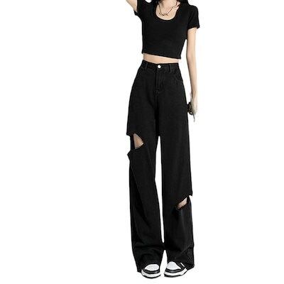 脚長効果!デニムパンツブロークンホールデニム女性夏ルーズストレートパンツ薄いワイドレッグロングパンツ