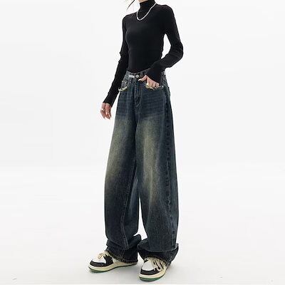 デニムパンツレディース ハイウエスト 細身 ストレート ゆったり カジュアルパンツ ワイドパンツ