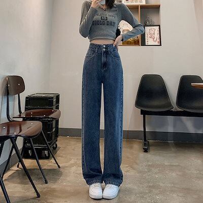 デニムパンツダブルボタンハイウエストジーンズ女性のたるみ感の薄い百緩いワイドパンツドラッグ