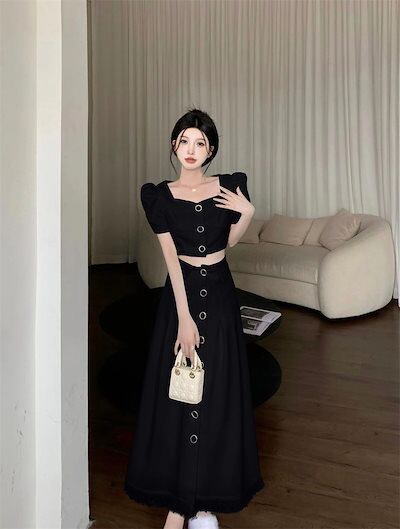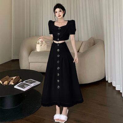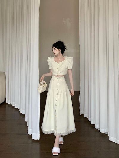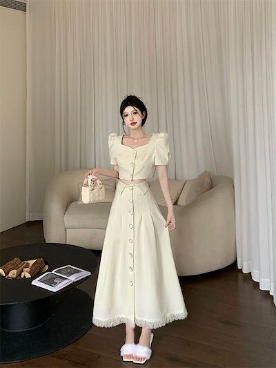 セットアップバブルスリーブショートトップス女性の夏韓国語バージョン+ワードフリンジデザインセンス半身スカート2点セット