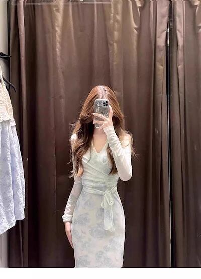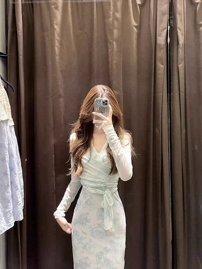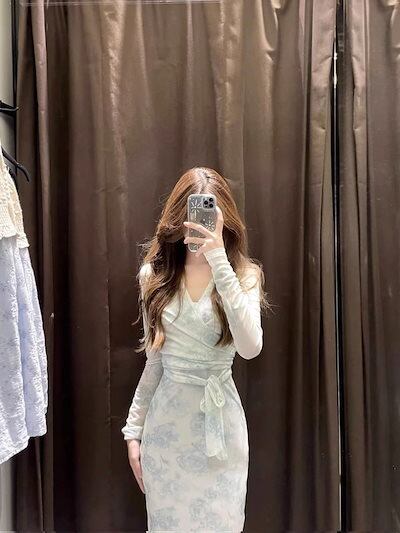 セットアップVネック花柄メッシュ長袖ワンピースレディースカーディガンスリムウエスト2点セット