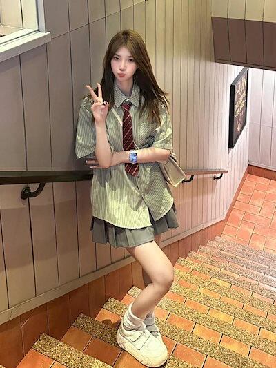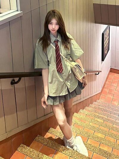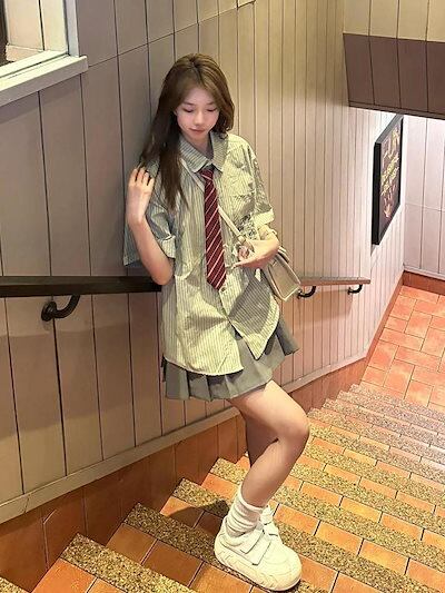 セットアップストライプシャツ女性半袖ルーズカレッジスタイルポロシャツJKカジュアルスーツ夏