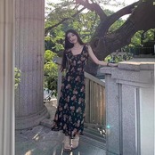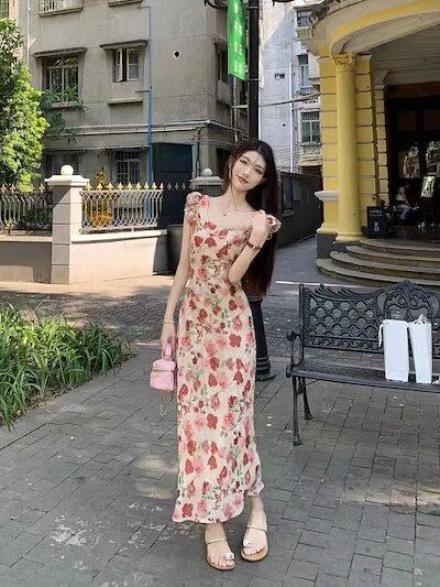 花柄ホルタードレス女性夏2024新しいフライフライスリーブウエスト細いAラインロングスカート