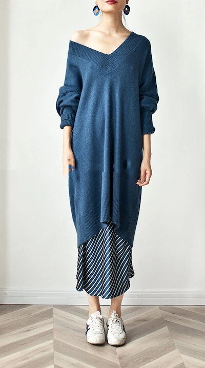 人気なリブニット ベーシックニット カシミヤタッチ 秋冬Vネックニットセーターレディースミドル丈厚手ゆったりセーターニットワンピース裹起毛 長袖トップス 大きいサイズ 体型カバー
