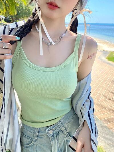 2024 カップ付きインナー タンクトップ 細肩ベルト付きキャミソール春夏2024 美背 下着胸当て付きオールインワンインナーボトムトップス