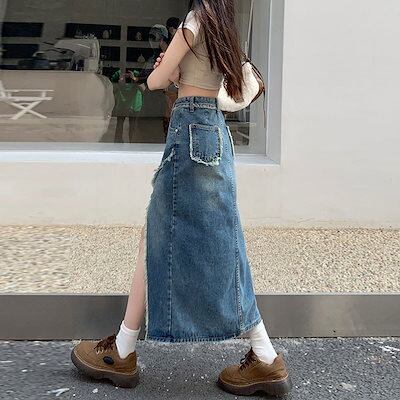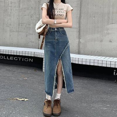 ハイウエスト スリット カットオフ デニムスカート ロングスカート ボトムス 切りっぱなし フレイドヘム ダメージ クラッシュド カジュアル 韓国ストリート スタイルアップ02