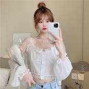 2024 夏 韓国 ショート丈 薄手透かし編み 2点カーディガン トップス長袖紫外線対策 UVカット冷房羽織り加工きれいめライトニット オフィス OLへそ出し フレンチシースルーファッション韓国レディ