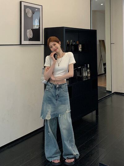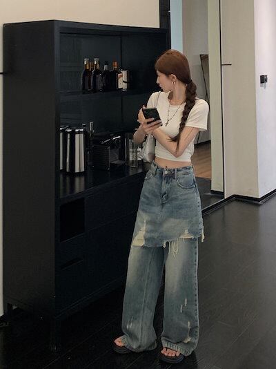 2024 夏 韓国パンツ ロング丈 デニム ジーンズ 2枚重ね ハイウエスト 美脚効果 脚長効果 細見え 夏 おしゃれ かわいい 韓国系ファッション レディース 加工メンズライク