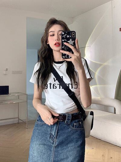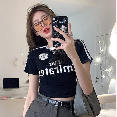 2024 夏 韓国トップス プリント半袖 Tシャツ 韓国 ラウンドネック スリム 可愛い風へそ出し ショート おしゃれスリーブ カジュアルサイドコーデ丈 ファッション系レディースフレンチお出かけ T
